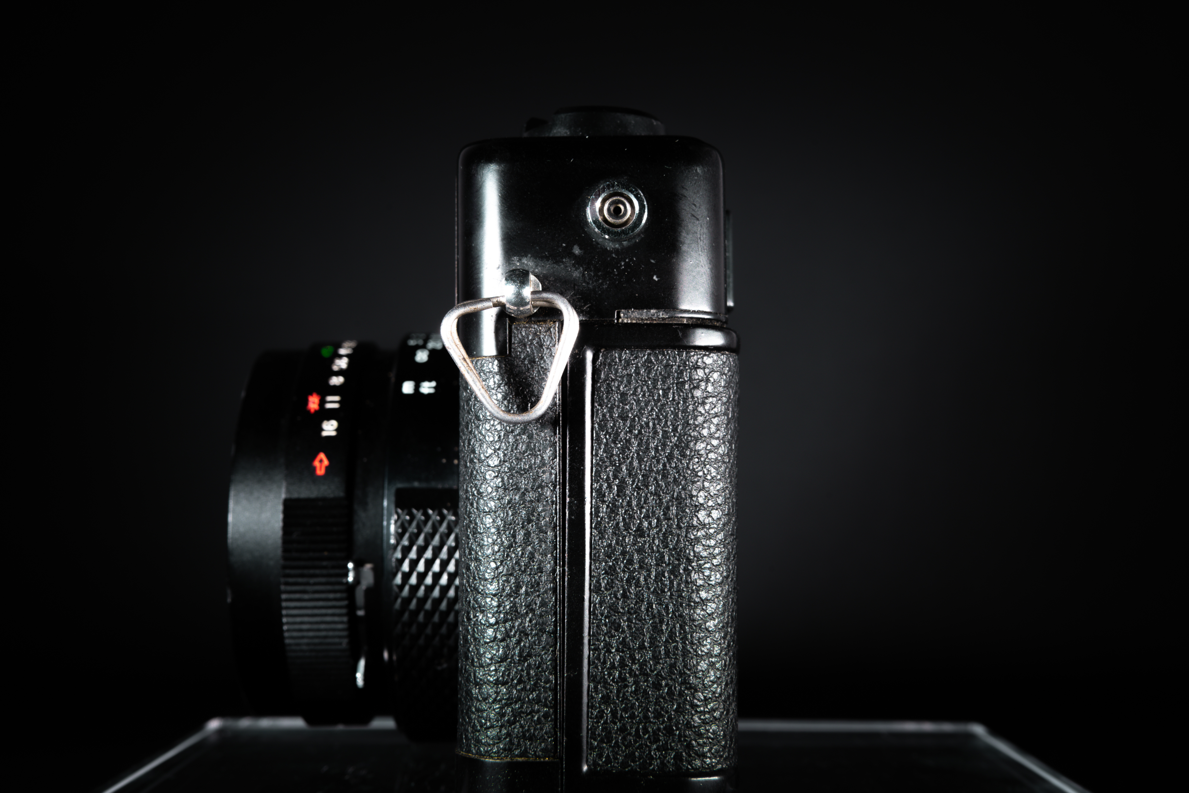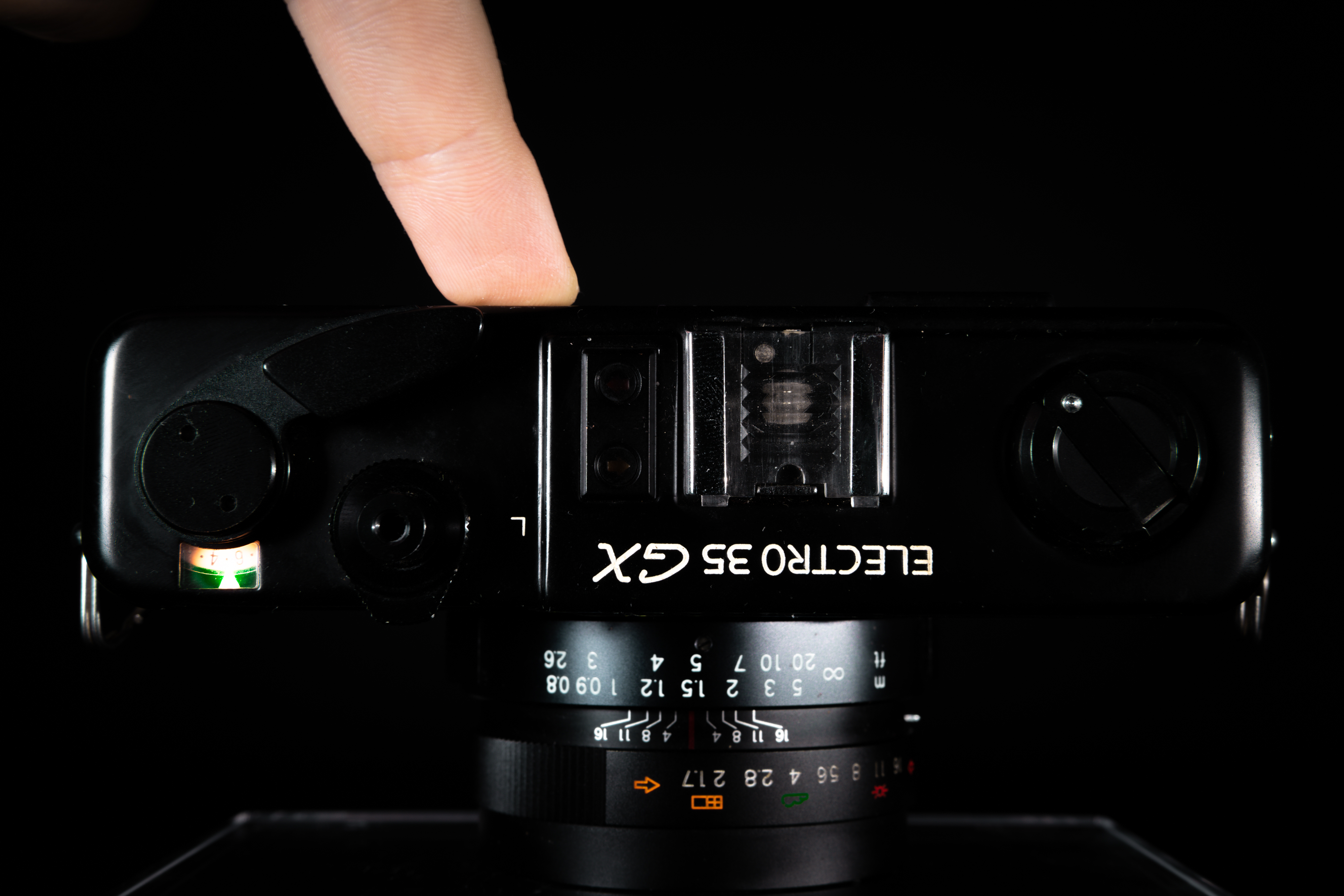 배터리가 들어있는 상태에서 반셔터를 눌러주면 노출계가 밝기를 측정해서 상판에 화살표를 점등시켜 알려준다.